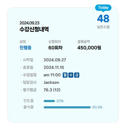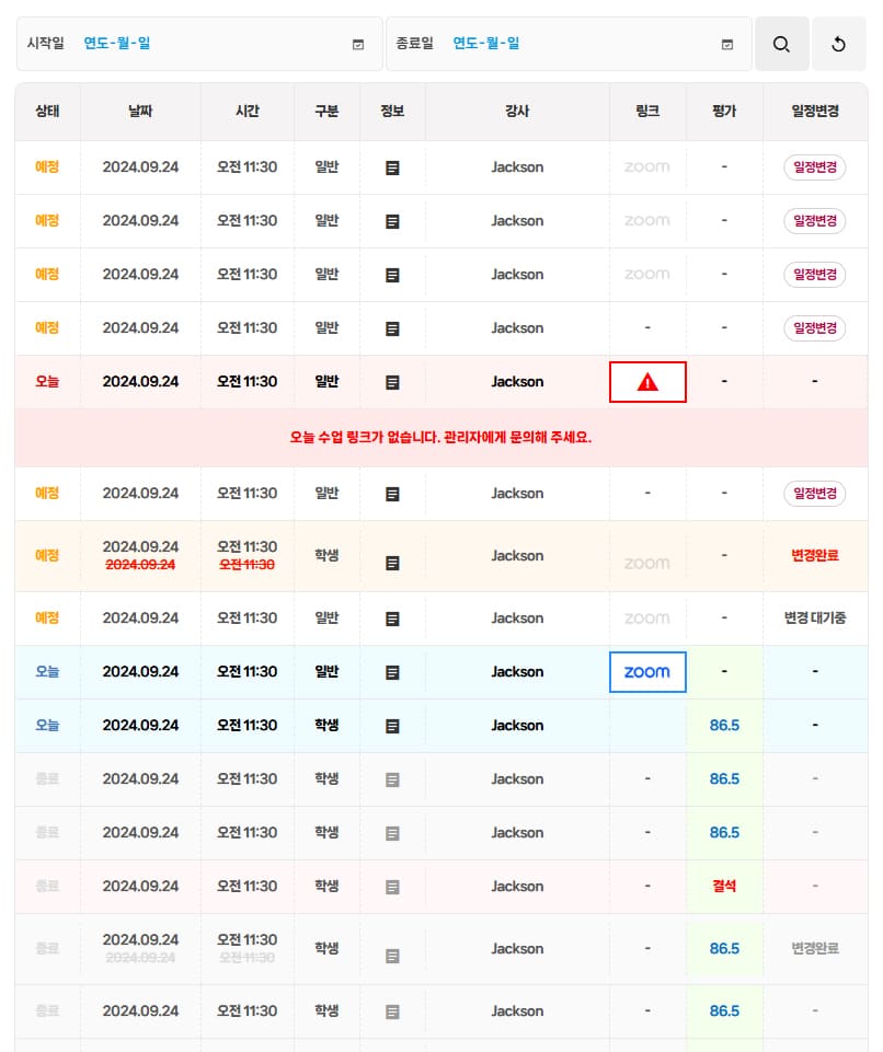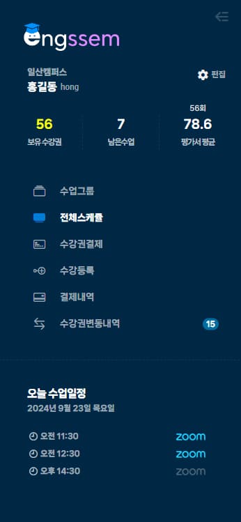 ENGSSEM 회원이 되시면 자동으로 나의 수업관리페이지가 생성됩니다. 수업이 없어도 기본 생성되며, 수업이 시작되면 이곳에서 수업관리 부터 평가서까지 모두 확인이 가능합니다.