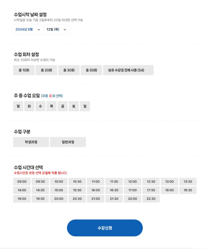 수강신청을 위해서는 반드시 수업을 시작하는 날짜부터 설정을 해야합니다. 수업시작일은 수강신청 당일 기준으로 최대 20일 이내의 날짜만 선택이 가능하고, 이후에 요구하는 항목에 따라 진행을 하시면 수업배정이 시작됩니다.